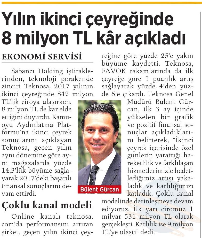 2016’da almış olduğumuz tedbirler meyvelerini vermeye devam ediyor. Oldukça zor başlayan ve devam eden 2017 yılının ilk 6 ayını karlı bir şekilde kapatmanın mutluluğunu yaşıyoruz. Teknosa’daki iş arkadaşlarımın katkısı son derece büyük, hepsinin ellerine sağlık. Herkes çok yoğun, çok fedakarca ve çok keyifle çalışıyor ve tabii ben de. Bu başarılı grafiği daha da iyi bir şekilde yukarılara taşıyarak 2017′ yi en iyi şekilde tamamlayacağız. Ve sonraki yıllara da hazırlanıyoruz aynı zamanda…